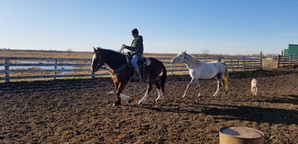 Ami is a 10 year old, 16 hands high Clydesdale Quarter Horse cross mare. Ami has been ridden all across Alberta and British Columbia. She has been ridden many years in the back country, including the Willmore Wilderness, Ya Ha Tinda, Fort Assiniboine, just to name a few, on many multi day trips. She has experience carrying dogs on her back over high fast flowing rivers, assisting wagon teams slug through the mud using a dally up on the saddle. She is trained to pull logs out of the bush for the evening fire camp and ponies other horses like a champ. I have been using her for years to assist me in breaking green horses or pull the kids in the sleigh. We have used her for ski-joring around the ranch too! Ami has also competed in competitive trail in the heavyweight division. She placed first in her very first race!