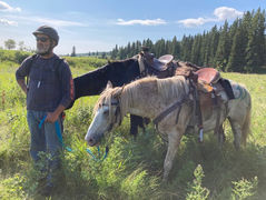 Mercury has been used around the ranch, ridden on roads, trails and has competed in a 25 mile competitive trail ride with a junior rider (they won first place!). He has crossed water, ridden past cattle, longhorns, elk, moose, deer and is used to dogs. He is easy to catch and good for the farrier; he has also has front shoes on to protect his feet from the gravel roads we sometimes ride on. This guy can ride in the front, middle or back, it's all the same to him!